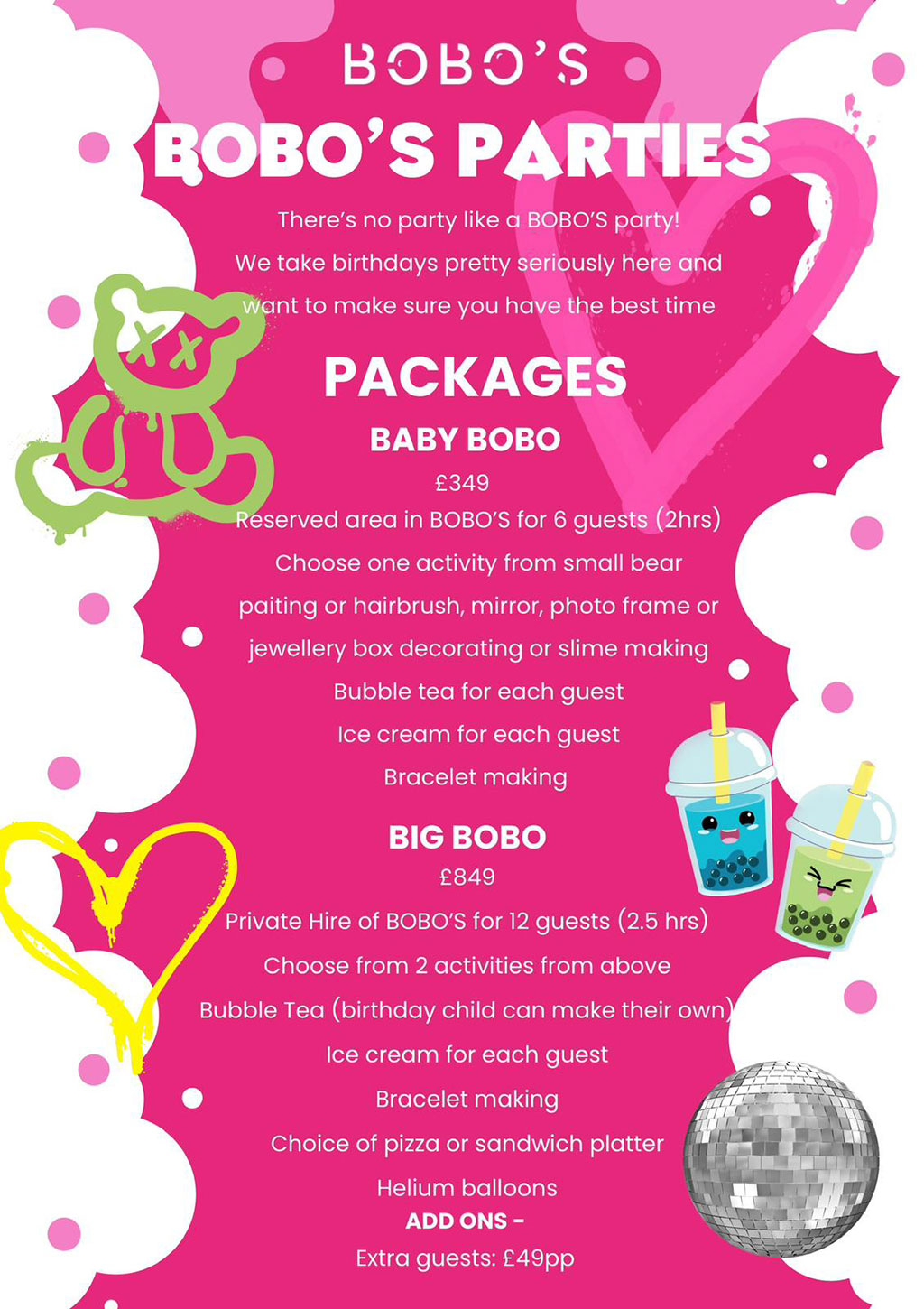 With milkshakes and desserts on offer, as well as imported bubble teas and gelato included in the price, these are parties you’ll remember forever.
